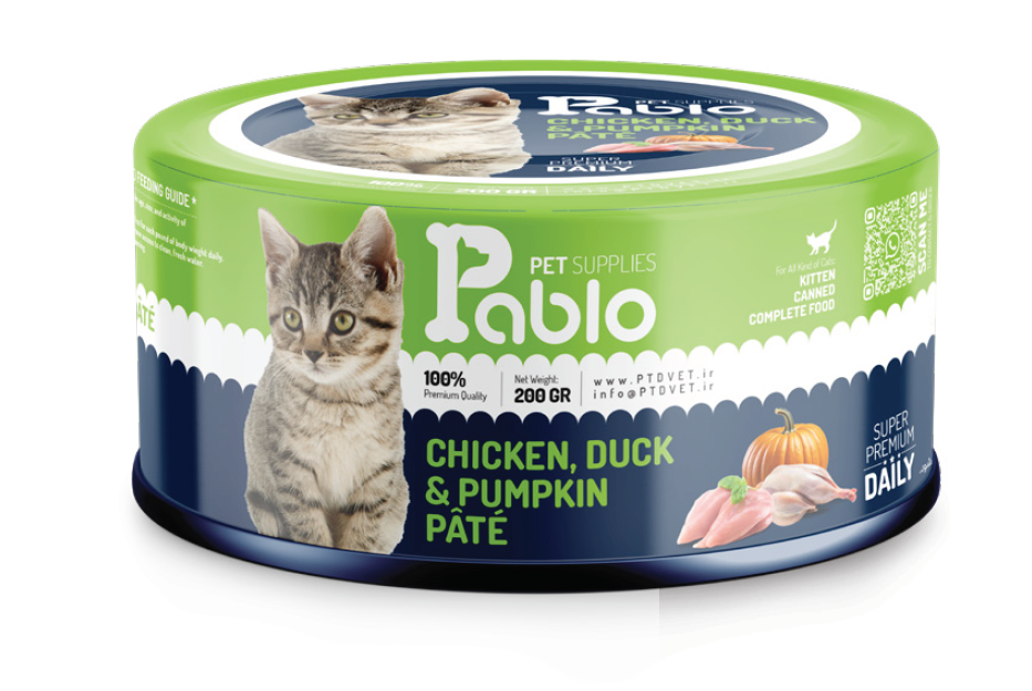 🍼🍎 کنسرو گربه پابلو اولترا پریمیوم طعم مرغ اردک و کدو (مخصوص بچهگربه)